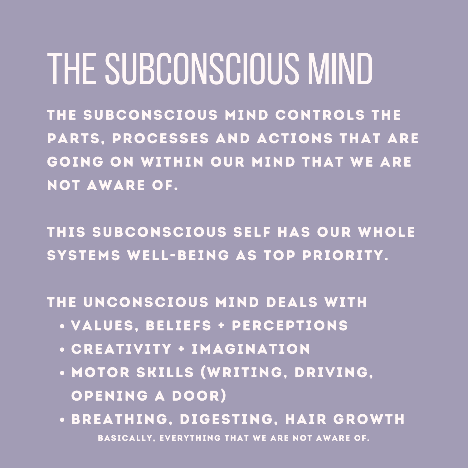 Our unconscious (or subconscious) mind is what keeps us alive. This part of our mind is what keeps our blood flowing, heart pumping, cells communicating and neurons firing and wiring together (and so, so, so, so much more). It is what formed us all in the womb, and allowed us to be where we are today.